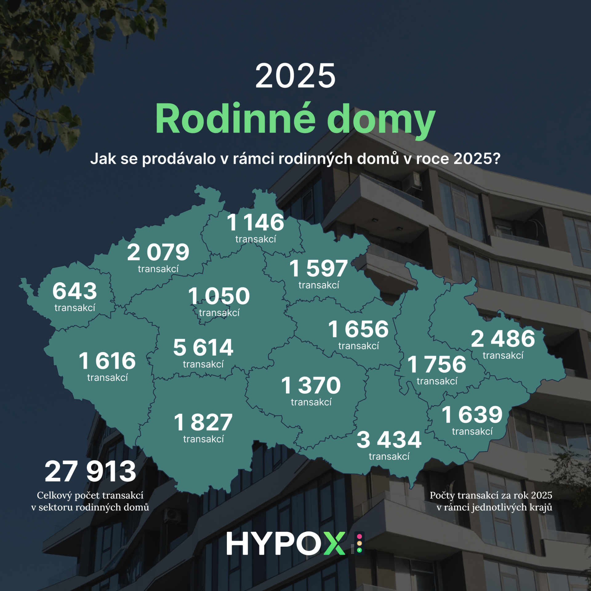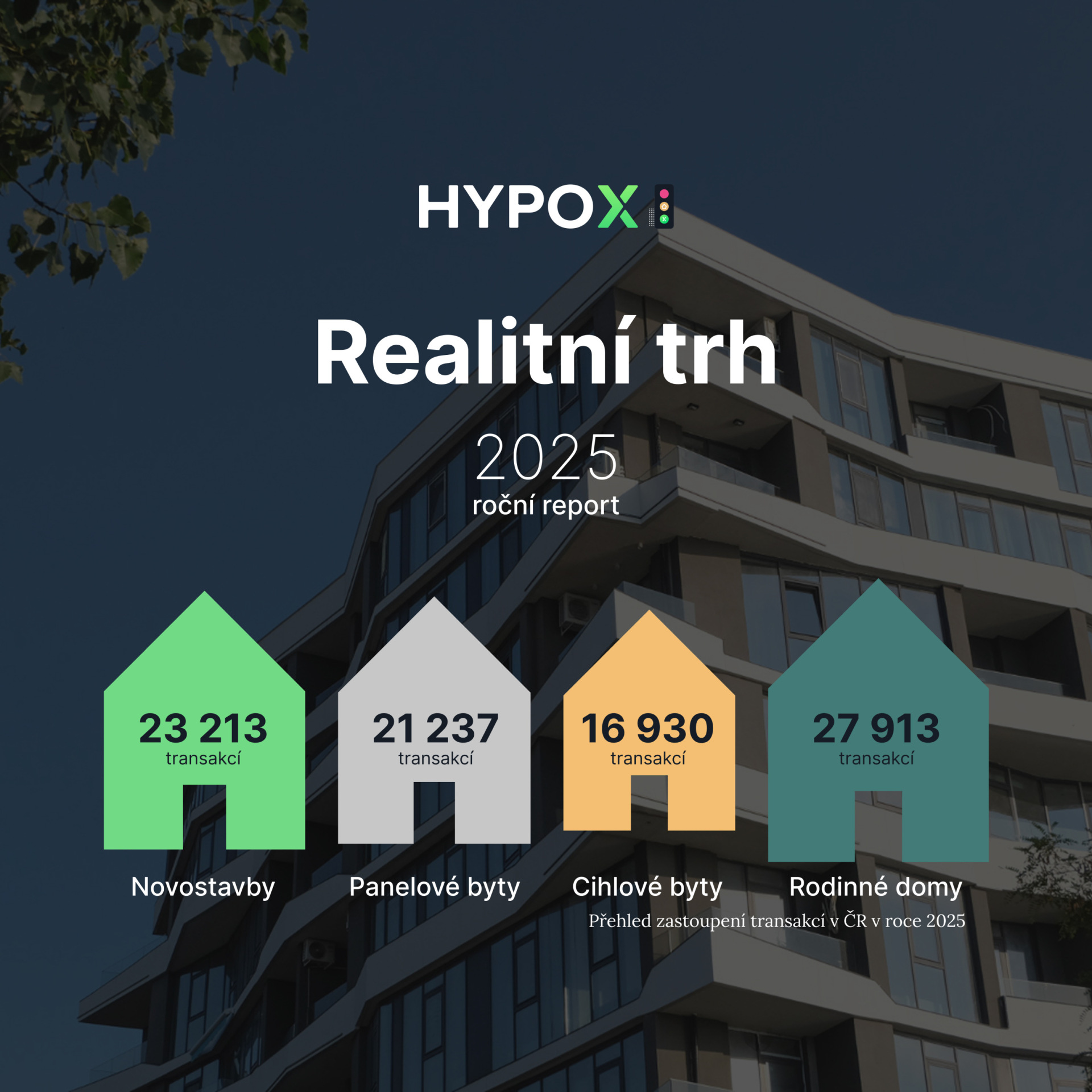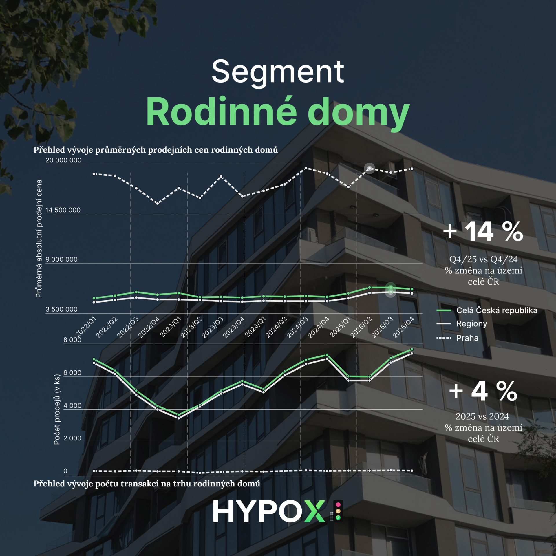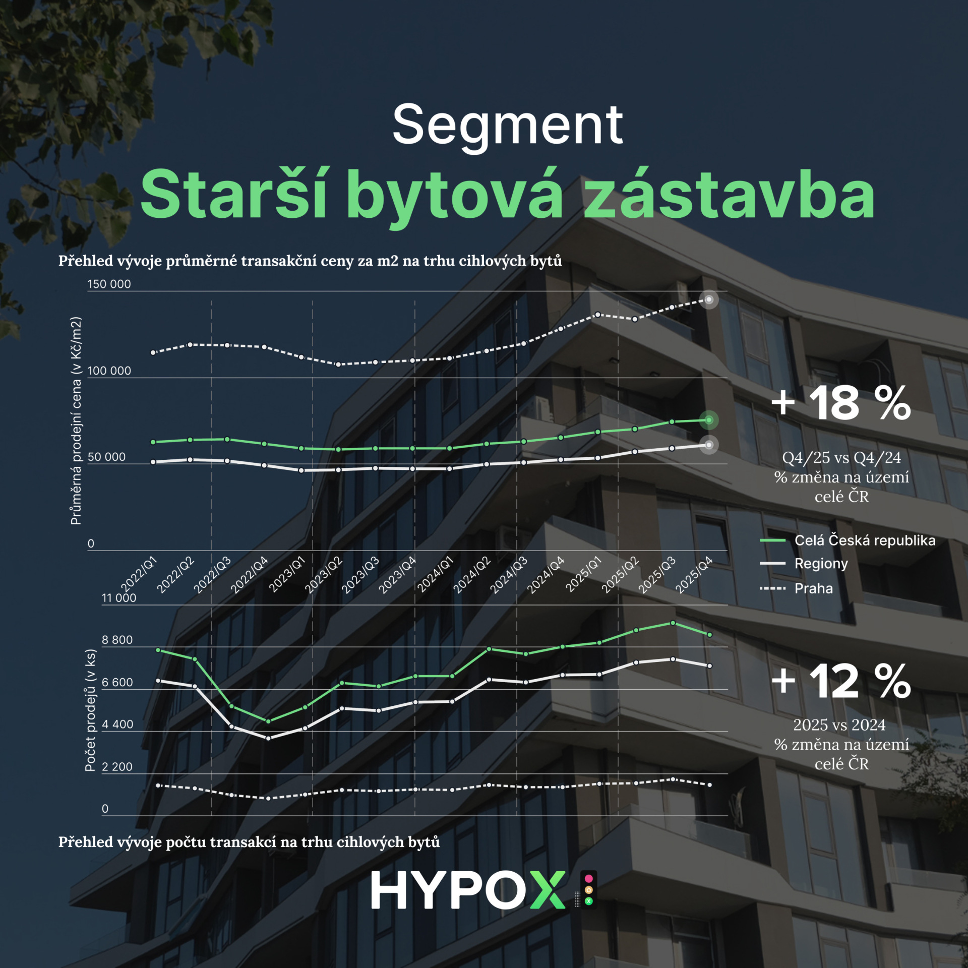 Dle HYPOX Semaforu rezidenční trh v Q4/2025 potvrdil rekordní rok. Rok 2025 se do historie českého realitního trhu zapíše jako období definitivního návratu silné aktivity. Zatímco roky 2022 a 2023 byly ve znamení útlumu a vyčkávání, od roku 2024 trh znovu sílí a loňský rok přinesl meziroční nárůst prodejů o dalších 11 %. Trh poháněla kombinace odložené poptávky, stabilizace ekonomiky a především extrémně silného hypotečního trhu. Ceny nemovitostí v celorepublikovém průměru stouply o 12 %, což jasně ukazuje, že hlad po vlastním bydlení v Česku nepolevuje ani při vyšších cenových hladinách.