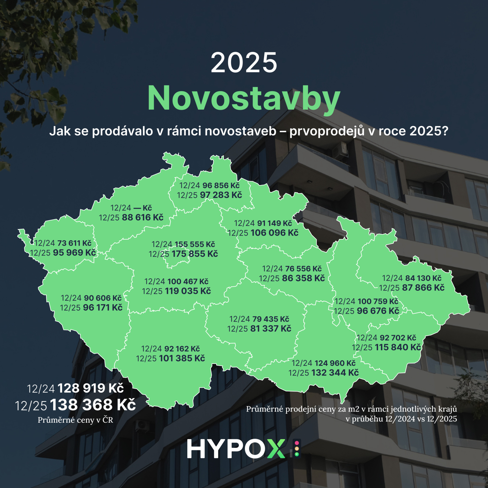 Cenově novostavby v prosinci 2025 pokořily další milníky. V Praze se průměrná prodejní cena nových bytů vyšplhala přes hranici 175 000 Kč/m2. Pokud se podíváme na celorepublikový průměr, ten u projektů přímo od developerů činil téměř 139 000 Kč/m2. Zajímavým fenoménem roku byl trh s "zánovními" novostavbami (přeprodeje), kde ceny rostly ještě agresivněji než u prvoprodejů – v průměru o 13 % oproti 9 % v rámci prvoprodejů. To může reflektovat jak o něco nižší cenu nežli u nových bytů, tak fakt, že lidé jsou ochotni si připlatit za byt, do kterého se mohou ihned nastěhovat, místo čekání na dokončení výstavby.