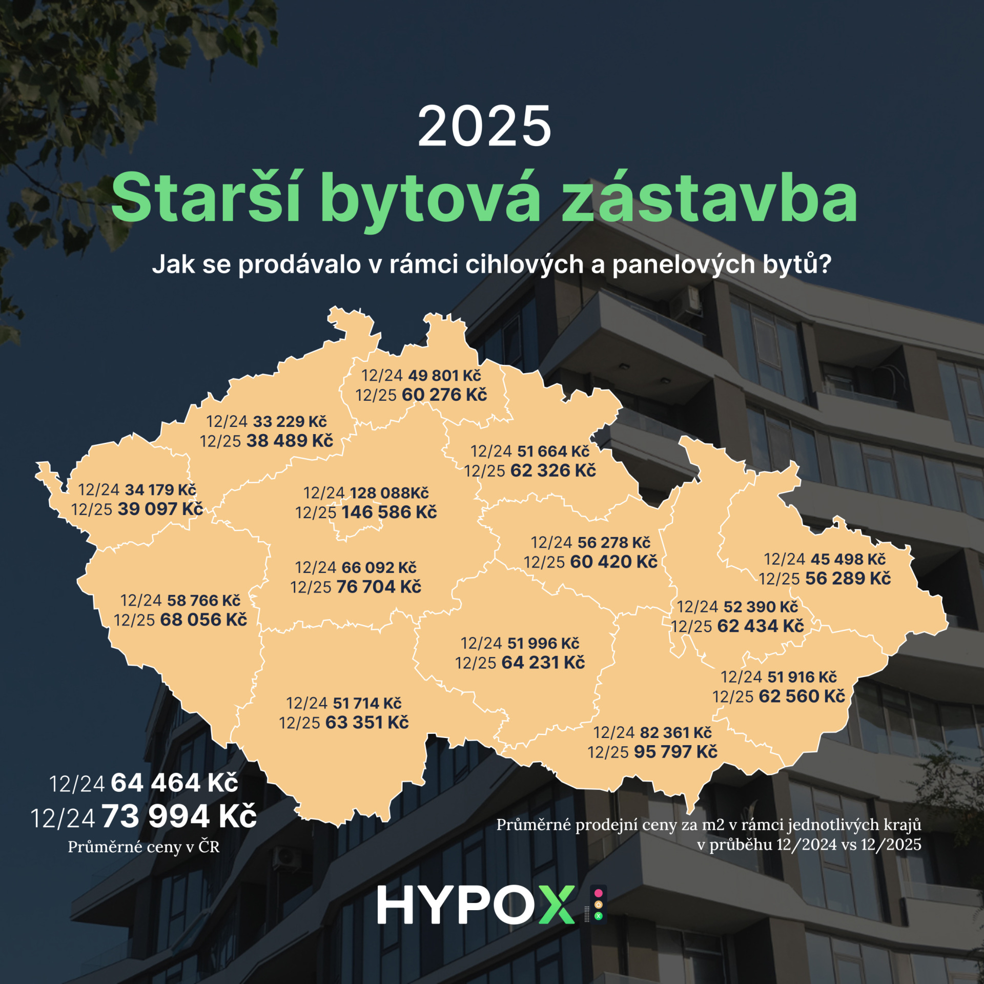 Přestože jsou panelové byty vnímány jako nejdostupnější varianta, i zde průměrná cena v prosinci 2025 vzrostla na téměř 71 000 Kč/m2. V Praze se panelové byty prodávaly v průměru za 130 000 Kč/m2.