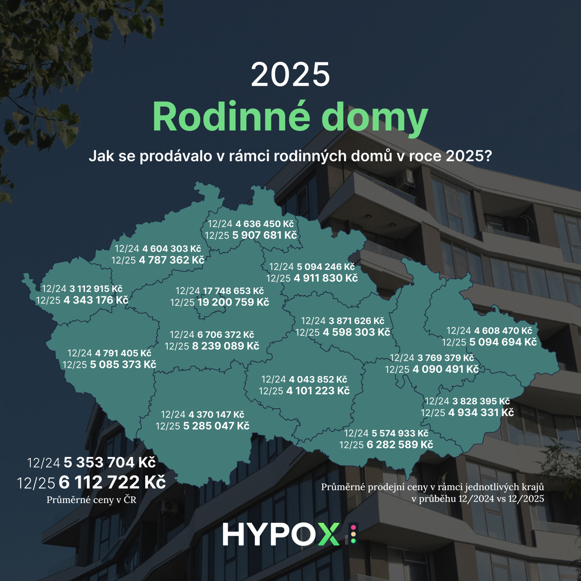 Trh s rodinnými domy v loňském roce rostl o mírnější 4 % z pohledu aktivity, ale ceny se zvýšily o citelných 14 %. Dominantním regionem zůstává Středočeský kraj, který těží z exodu Pražanů hledajících prostornější bydlení za dosažitelnější cenu. Zatímco v Praze stojí průměrný dům přes 19,2 milionu Kč, v rámci celé ČR je průměr 6,2 milionu Kč.