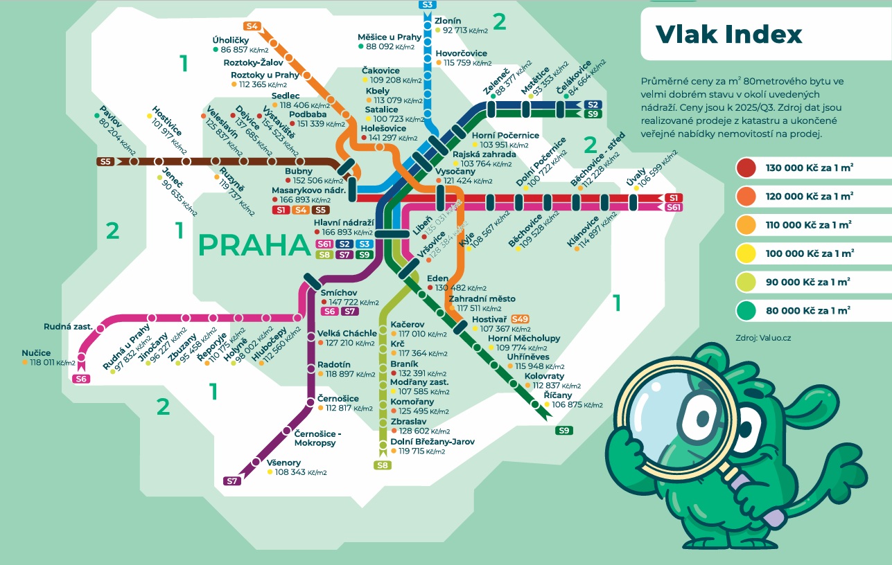 V mapce níže uvedené si ukážeme, jak se kolem Prahy chovají ceny bytů podle železničních stanic. Ne podle okresů, ne podle obcí, ale podle skutečné dostupnosti — tedy podle toho, kde vám zastaví vlak.